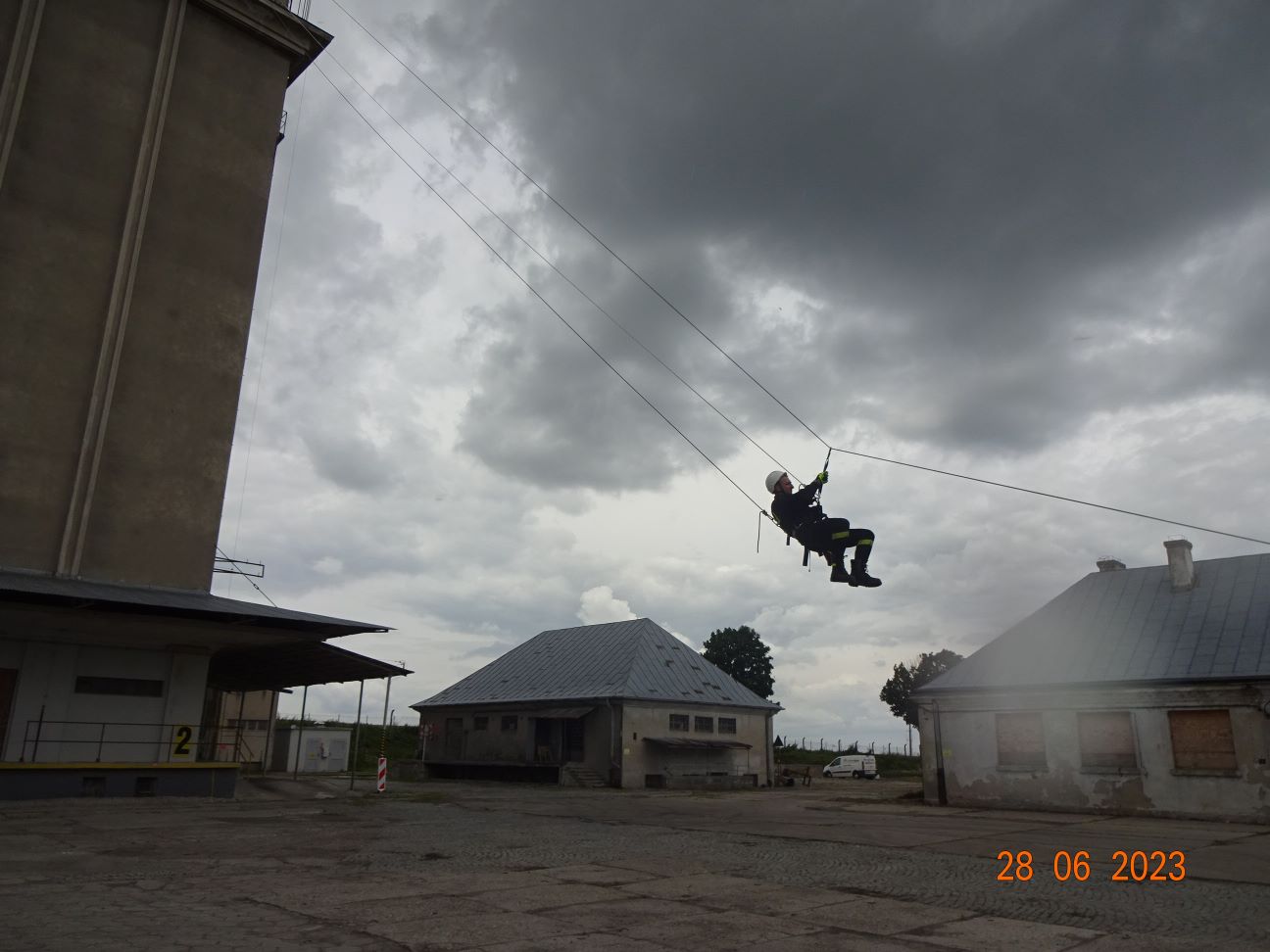 Szkolenie prowadzone było przez trzy dni na każdej zmianie służbowej (27 i 28 czerwca oraz 5 lipca 2023 r.). Każdy dzień ćwiczeń rozpoczynał się od omówienia zasad bezpieczeństwa podczas wykonywania działań na wysokości. Następnie strażacy musieli dobrać i przygotowywać do pracy sprzęt ratownictwa wysokościowego obowiązujący dla zakresu podstawowego. Pod okiem kolegów ze Specjalistycznej Grupy Ratownictwa Wysokościowego PSP przygotowywano stanowiska m.in. z trójnogiem ratowniczym, budowano układy do opuszczania lub wyciągania ratowników i osób poszkodowanych oraz sprawdzano swoje umiejętności podczas asekuracji i autoasekuracji.