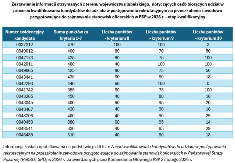Informacja została opublikowana na podstawie pkt 6 lit. c Zasad kwalifikowania kandydatów do udziału w postępowaniu rekrutacyjnym na przeszkolenie zawodowe przygotowujące do zajmowania stanowisk oficerskich w Państwowej Straży Pożarnej (ReKRUT SPO) w 2026 r. zatwierdzonych przez Komendanta Głównego PSP 27 lutego 2026 r.